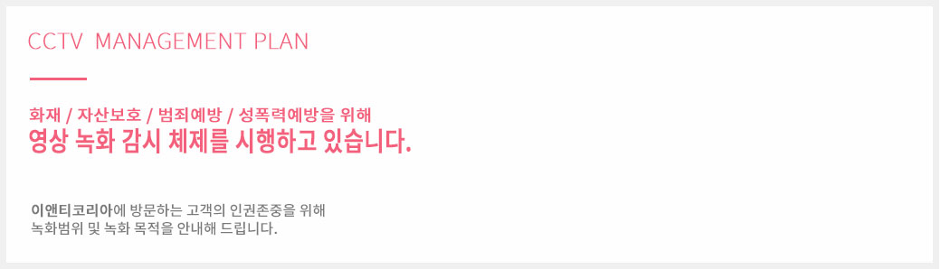 ¿µ»óÁ¤º¸Ã³¸®±â±â(CCTV) ¿î¿µ¡¤°ü¸® ¹æÄ§ ÀÌ¾ØÆ¼ÄÚ¸®¾Æ(ÁÖ) (ÀÌÇÏ ¡®È¸»ç¡¯¶ó ÇÔ)´Â °³ÀÎÁ¤º¸º¸È£¹ý Á¦27Á¶ Á¦7Ç× ¹× µ¿¹ý½ÃÇà·É Á¦25Á¶ Á¦1Ç׿¡ ÀǰŠÀû¹ýÇÑ ¹üÀ§ ³»¿¡¼ °³Àοµ»óÁ¤º¸¸¦ ¼öÁý¡¤º¸À¯ÇÏ¿© ¿µ»óÁ¤º¸ÁÖüÀÎ °í°´ ¹× ´ç»ç ÀÓÁ÷¿øÀÇ ±ÇÀÍÀ» º¸È£ÇÏ°í ¾÷¹«Ã³¸®¸¦ ¿øÈ°ÇÏ°Ô ÇÒ ¼ö ÀÖµµ·Ï ´ÙÀ½°ú °°ÀÌ ¿î¿µ¡¤°ü¸® ¹æÄ§À» µÎ°í ÀÖ½À´Ï´Ù.